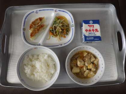 今日の献立は、豆腐の中華煮、ナムル、ぎょうざ、ごはん、牛乳 でした。 エネルギー:796kcal