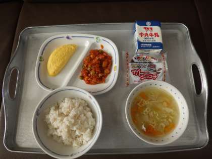 今日の献立は、「クリスマス献立」ということで、パスタスープ、チキンライス(麦ごはん)オムレツ、ガトーショコラ、牛乳 でした。