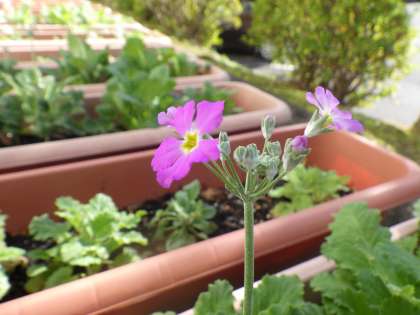 職員室前のテラスではサクラソウが植えられたプランターがずらりと並んでいます。校内で最も日当たりがよく、水の管理もしやすいため、草花を育てるには絶好の場所となっています。そのサクラソウがぽつぽつと花を咲かせ始めています。今年度の卒業式には、会場をきれいに彩ってくれることと思います。
