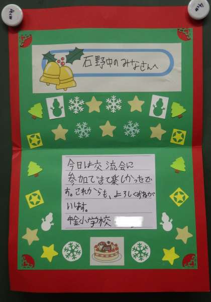4組の教室の黒板には、先週末実施された小中交流会で小学生からいただいたクリスマスカードが掲示されていました。自分たちの頑張りに対してこたえてえてくれた小学生から、心温まるプレゼントが届いた感じです。