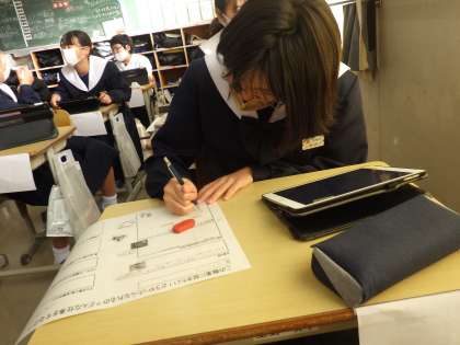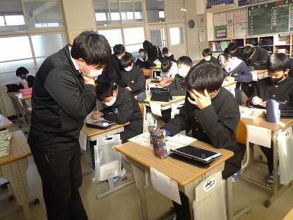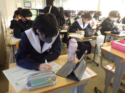 「自分の就きたいたい職業 どうやったらなれる?」と題して、職業調べを行っていました。来年度に実施の予定をしている「職場体験学習」に向けての事前学習です。すでに中前も公言している生徒もいれば、まだぼんやりとしか考えていないという生徒ももちろんいます。好きなこと、憧れている大人の姿、興味がある職種、以前取り組んだ職業適性の結果など、様々な角度からの質問で自分の将来について考えていきました。