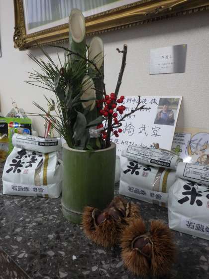 お正月の準備のため、校内整備員さんが学校周りに自生している竹を活用して、門松を作って届けてくださいました。飾られているマツやササ、ナンテンなどもすべてこの石野のもの。出来栄えにももちろん感心しましたが、地域のもので季節を楽しむ校内整備員さんの心意気にも感心させられました。