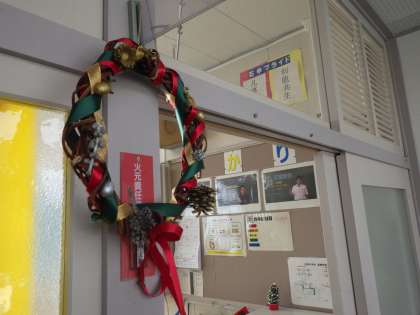 4組の教室の入り口には、クリスマスリースが飾ってありました。先日の小中交流会で参加した小学生からいただいたものです。派手に飾って学校生活の妨げにならないように気を使いつつ、世の中のムードもわずかに意識した控えめな飾り方です。