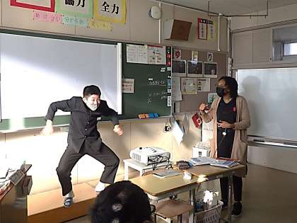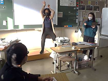 今日はALTとのコミュニケーション活動の授業でした。生徒、先生全員参加でのゼスチャーゲームです。答えが分かっても英語で答えなければならず、ゼスチャーを使って何とか答えようと必死です。途中、授業の様子を見に来た校長先生にも、出題として参加してもらっていました。