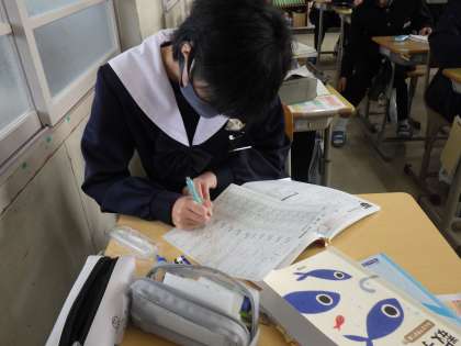 冬休みを前にして、学習した内容の総復習です。教科書の問題をもう一度解き直したり、テキストの問題に挑戦したりしています。分からなければすぐに聞きに行ったり、助けを呼んだりしています。