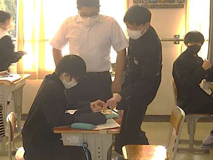 (英語の授業の前が体育と音楽。教室に生徒がいない間に、教科担任とALTが質問カードを教室内にちりばめる準備をしていたようです)