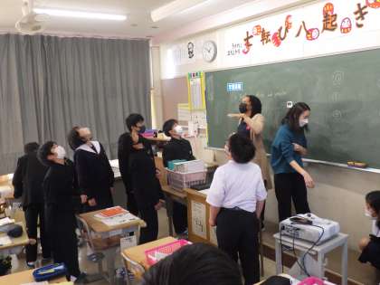 今日はALTとのコミュニケーション活動の日です。最初に、「hippopotamus(ヒポポタマス)」というイギリスの伝承童話の曲を聴き、歌詞が記されたプリントの穴埋めに挑戦していました。習った単語でもなかなか聞き取りが難しいことを実感していました。