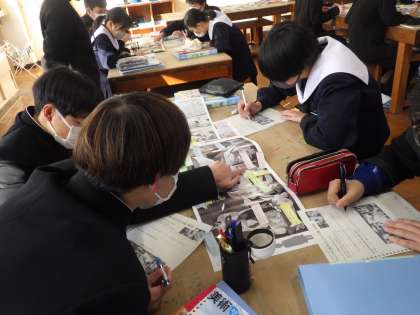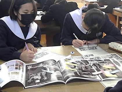 「『ゲルニカ』に込められたピカソの想い」というテーマで、鑑賞の学習が行われていました。グループごとに個人が出した意見を共有していきます。仲間の感じたないようにも共感し、新たな発見もあったようでした。