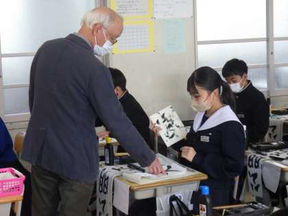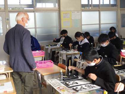 冬休み明けすぐに実施される書き初め大会に向けの練習が始まりました。今日は書道ボランティアさんにお越しいただき、一文字ずつ丁寧にポイントを教えていただきました。