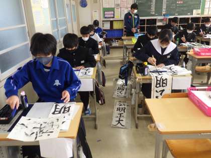 冬休み明けすぐに実施される書き初め大会に向けの練習が始まりました。今日は書道ボランティアさんにお越しいただき、一文字ずつ丁寧にポイントを教えていただきました。