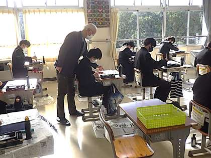 冬休み明けすぐに実施される書き初め大会に向けの練習が始まりました。今日は書道ボランティアさんにお越しいただき、一文字ずつ丁寧にポイントを教えていただきました。