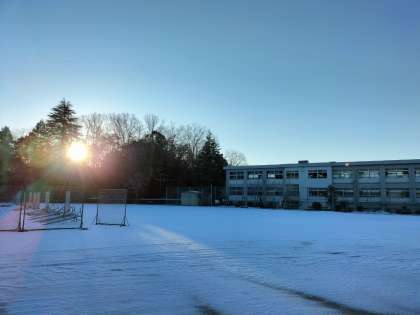 昨日の朝は、この辺りでは久しぶりの雪の影響で、少し大変だったと思いますが、今日は一転、快晴の空を見ることができます。道路の雪は昼頃からなくなりましたが、運動場の雪は今朝もまだきれいな状態で残っています。
