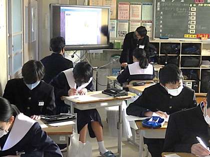 これまで準備を進めてきた最上級・比較級の文法を利用してのプレゼン発表が行われていました。仲間に調査した結果をグラフ化し、それぞれの興味あるテーマで発表していました。2つのグループに分かれ、教室を前後に分けての発表会です。タブレットの操作も含め、どの生徒も準備・練習の成果を発揮していました。