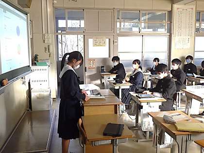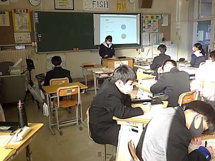 これまで準備を進めてきた最上級・比較級の文法を利用してのプレゼン発表が行われていました。仲間に調査した結果をグラフ化し、それぞれの興味あるテーマで発表していました。2つのグループに分かれ、教室を前後に分けての発表会です。タブレットの操作も含め、どの生徒も準備・練習の成果を発揮していました。
