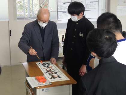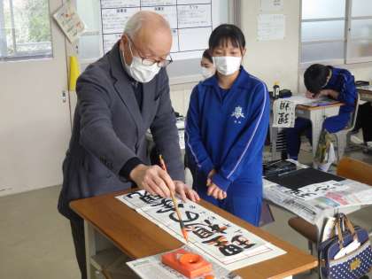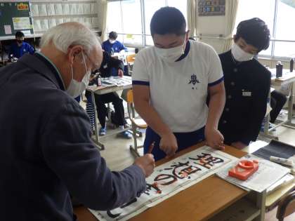 書道ボランティアさんによる書き初め練習会の2回目です。今日は、それぞれが書き上げた作品を一人ずつ丁寧に添削してくださいました。自身の文字の癖や手本のような文字にするためのコツを教えていただきました。添削後も意欲的に練習に臨んでいる姿が印象的でした。