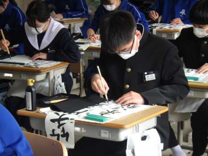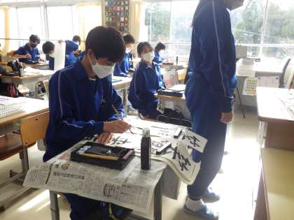 書道ボランティアさんによる書き初め練習会の2回目です。今日は、それぞれが書き上げた作品を一人ずつ丁寧に添削してくださいました。自身の文字の癖や手本のような文字にするためのコツを教えていただきました。積極的にご指導を受けに行き、その後の練習に生かしている姿が印象的でした。