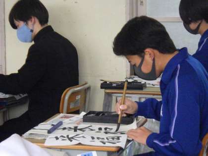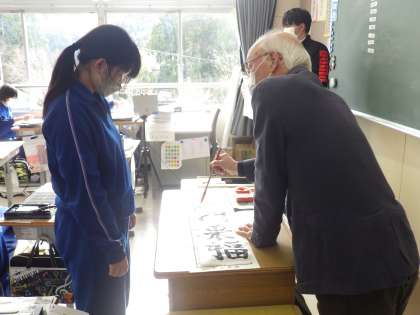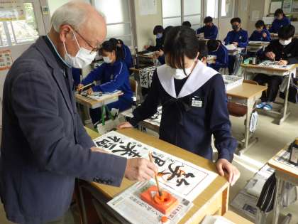書道ボランティアさんによる書き初め練習会の2回目です。今日は、それぞれが書き上げた作品を一人ずつ丁寧に添削してくださいました。自身の文字の癖や手本のような文字にするためのコツを教えていただきました。積極的にご指導を受けに行き、その後の練習に生かしている姿が印象的でした。