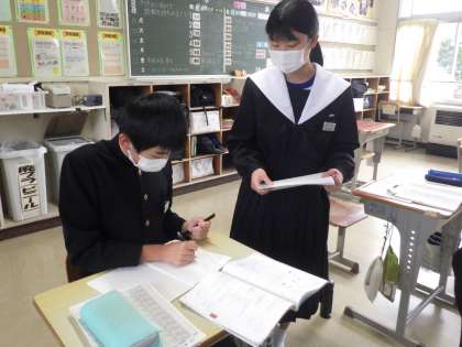 三平方の定理を使った演習問題に取り組んでいました。教科担任に正解を確認してもらった生徒からどんどん動き出し、仲間の解答を確認していきます。どうしても解けないようであれば、ヒントを出したり、解き方の解説もしていきます。
