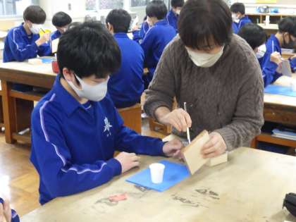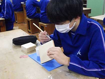 木彫で、幾何学模様を施したコースターづくりもいよいよ最終段階のニス塗りです。透明なニスではなく少し色のついたニスのため、塗り方次第で高級感がさらに増してきます。