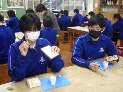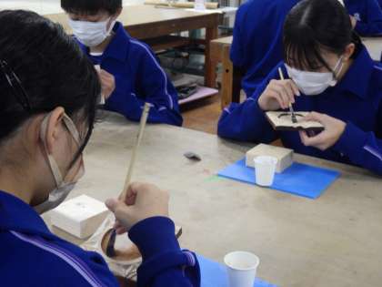 木彫で、幾何学模様を施したコースターづくりもいよいよ最終段階のニス塗りです。透明なニスではなく少し色のついたニスのため、塗り方次第で高級感がさらに増してきます。