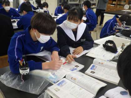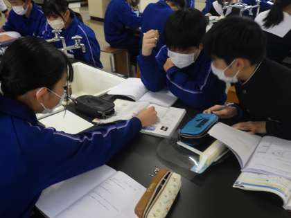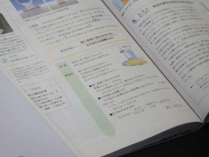 気圧について学んでいました。アルミ缶が凹む実験を観察したあと、圧力は面に加わる力とその面積に関係があることを確認し、終盤では例題を解いていました。