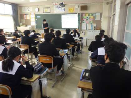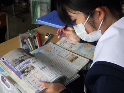 アヘン戦争について学んでいました。戦争が起こった原因をわかりやすく解説するとともに、その時の世界のぃにの動きも裏話として盛り込まれています。十分に盛り上がったところで、「ここからが重要! ペンを持って!」など、切り替えのことばもタイミングよく入り、生徒の集中力を切らせません。