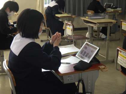 日本の文化を外国人に紹介するためのプレゼン発表会が行われていました。自身で用意したパワーポイントの資料を写しながら、すべて英語で説明していきます。それを聞いている生徒全員が、それぞれにコメントを残していきます。