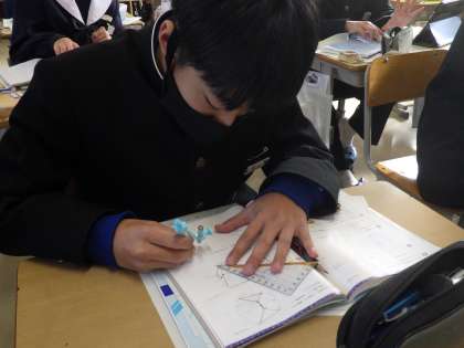 冬休みを明日からに控え、家庭でも一人で学習できるようにと、平面図形の総復習が行われていました。教科書に出題されている様々なパターンの問題に、これまでの授業を思い出しながら取り組んでいました。