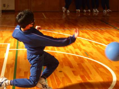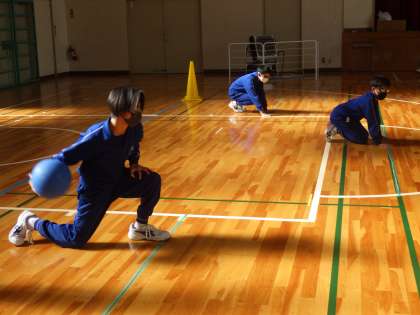 今年度、全学年を通して最終回となったゴールボールの授業。男女混合のチームで協力し合い、白熱したゲームが繰り広げられました。