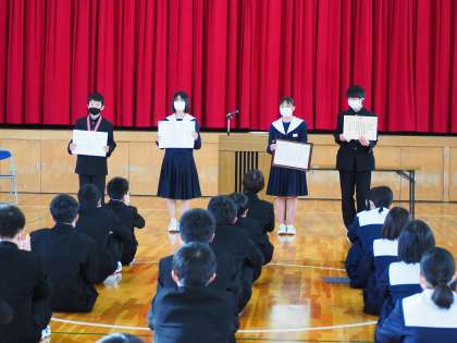 校長先生の話のあとは、表彰伝達でした。表彰内容は、以下のとおりです。