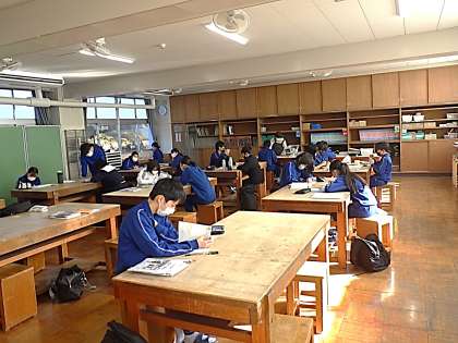 この教室では、各自が持参した冬休みの課題に取り組んでいます。黙々と課題を進める生徒、先生に解き方をアドバイスしてもらう生徒、仲間とペースを決めて課題に取り組んでいる生徒など様々です。