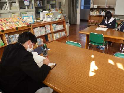 3年生の教室では、入試対策として面接練習が行われていました。面接官は学年主任や担任が交代で行い、様々な質問にいかに答えるかを練習していました。