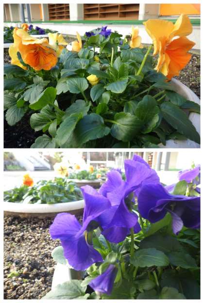 冬休み初日の雪の日も耐え、今日も花壇の花たちは、色鮮やかにしっかりと咲いてくれています。寒さで縮こまっている人間を鼓舞しているようにも見えます。