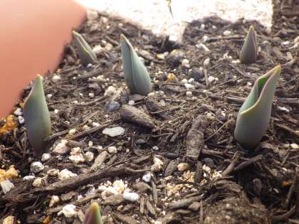 職員室前のテラスに並べられてプランターからは、春の訪れを感じる光景が見られるようになりました。写真は、発芽を始めたチューリップの様子です。どの色が咲くかはまだ分かりませんが、“楽しみ” なのは確かです。まだまだ寒い日は続きますが、立派に成長していってほしいと思います。