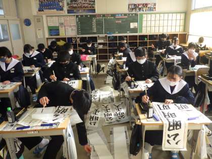 全校集会のあとに行われた書き初め大会・1年生の様子です。