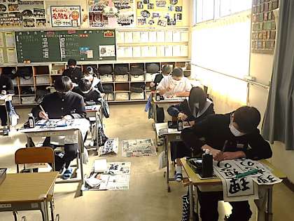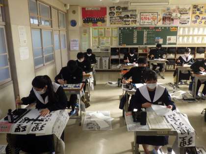 全校集会のあとに行われた書き初め大会・3年生の様子です。