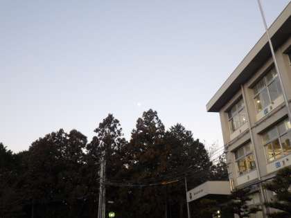 昨日の朝にも紹介した明け方の月の様子。しかし今日は、昨日よりも遅い間もなく7時になろうとしている時にはこの高さにありました。学校の時計がくるっているのか、自然の当たり前の現象なのか…。謎は深まります。