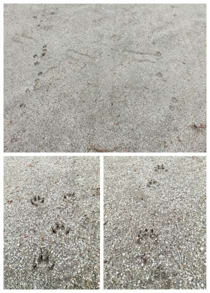 運動場をよく見てみると、2匹の動物の足跡が並行して残っているのを見つけました。左側の方が若干くっきり残っています。時間的な差なのか、移動するスピードの差なのか、体重の重さなのかはわかりませんが…。