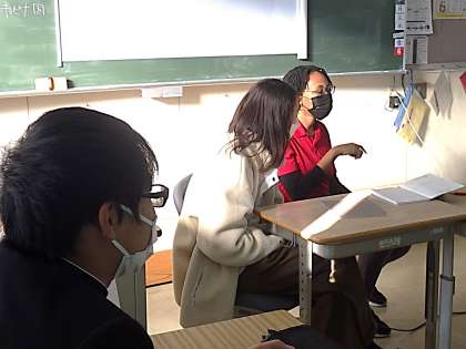 今日はALTとのコミュニケーション活動の日です。海外のコメディアンが出演している英語の映像を見ながら、いろいろな英語の質問に答えていきます。映像そのものもおもしろく、笑い声も絶えない授業でした。