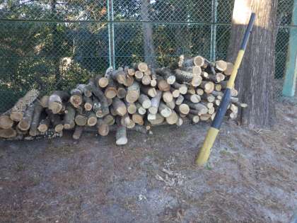 運動場の西側の植わる巨木・メタセコイヤの根元にたくさんの木切れが積まれています。冬休みの間に校内整備員さんが、近所で切り取った木を薪用に持ってきてくださったものです。今後はすぐに使えるサイズに加工され、防災倉庫に収納していきます。