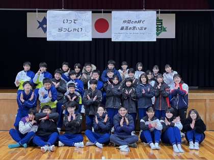 1/12 自然教室 3 公開日 2023/01/12 更新日 2023/01/12 各学年から 出発式を終え、最初の記念撮影です。 生徒たちの頭上には、1年生からのメッセージの寄せ書きが掲げられています。