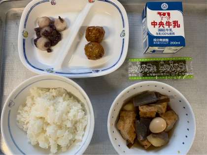 今日の献立は、「鏡開き献立」ということで、関東煮、ぜんざい、ごぼう入りつくね、味付けのり、ごはん、牛乳 でした。 エネルギー:893kcal