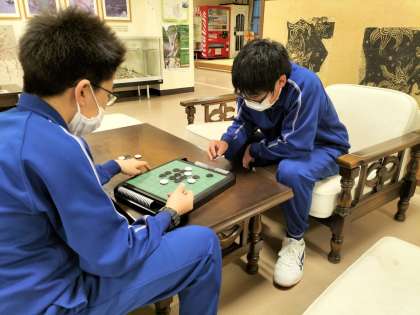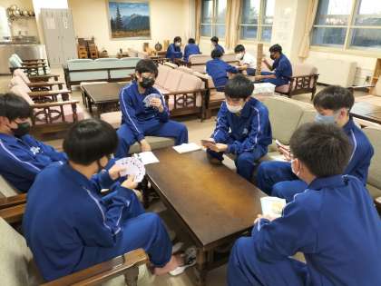 スキー研修での疲れをお風呂で取ったあと、仲間とのコミュニケーションの時間です。 それぞれがゲームなどを楽しんでいます。