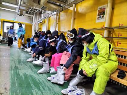 午前のスキー研修を終えた生徒たちが、続々と戻ってきました。