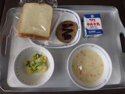今日の献立は、ポタージュスープ、コーンサラダ、ハンバーグサンド(スライスパン)、牛乳 でした。 エネルギー:856kcal