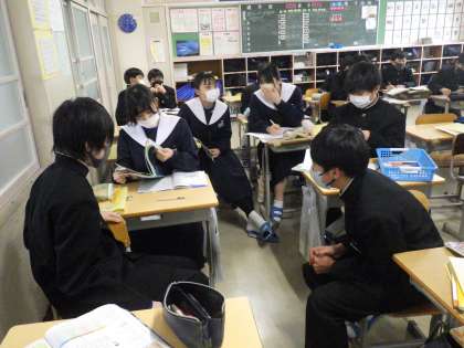 教科書の本文を読んだ後、提示される分がその内容とあっているかどうかを確かめていました。グループで話し合い、自分の意見も言いながら確認し合っています。
