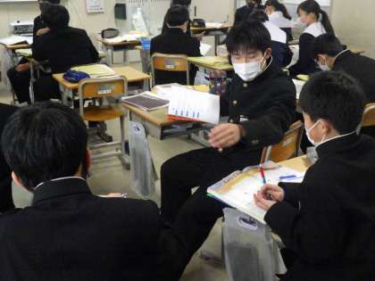教科書の本文を読んだ後、提示される分がその内容とあっているかどうかを確かめていました。グループで話し合い、自分の意見も言いながら確認し合っています。