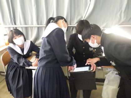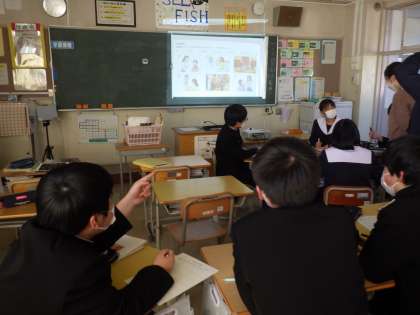 教科書の本文の内容を黒板に提示されたイラストにあてはめ、説明していく授業でした。グループで相談しながら、どの場面のどんなことを表現しているのか発表していきます。英文の内容をしっかり理解しないとできない活動です。