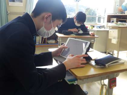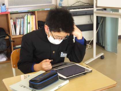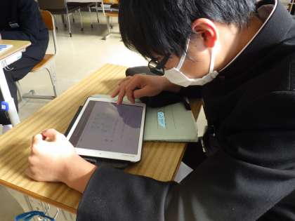 学習用タブレットのアプリを使って、因数分解、平方根、速さ、単位量当たりの平均、分数のかけ算・わり算など、各自の課題に挑戦していました。