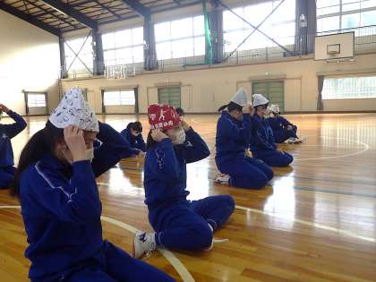 中学校に入って初めての武道(剣道)の授業。前回までに「剣道」の調べ学習を終え、知識としてはある程度頭に入っています。初回の今日は、面の下につける面下(手拭い)の作り方を学んでいました。「心落ち着け、丁寧に早く」を目標に、何度も取り組んでいました。